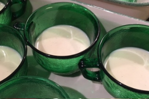 Pannacotta on tunnetusti kermainen jälkiruoka, tässä sitä keventää ja  raikastaa piimä. Mansikka-basilikakastike on puolestaan raikas tuulahdus pannacotan päällä. Tämä makuyhdistelmä sopii myös kevään ja kesän juhliin! Tarjoiluastioiksi valitsin mummon vihreät, lasiset, vihreät kahvikupit, siten sain  värimaailmastakin  vahvan: punavihreä kontrasti imee puoleensa ja kutsuu maistamaan. Lisäefektiä saa vielä muilla kirkkailla väreillä, kuten syötävillä kukilla.